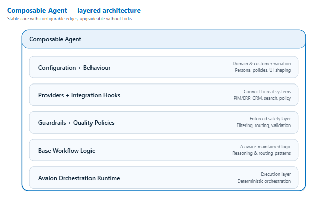 In Zeaware Avalon, configuration is the first layer of composability. It allows each agent to adapt to a customer or domain without modifying the underlying workflow.