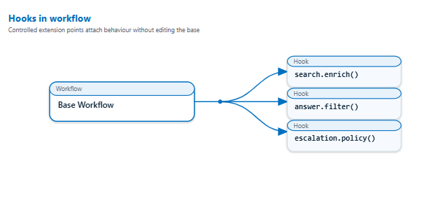 Hooks are controlled extension points inside the agent workflow where teams can attach implementation-specific logic without modifying the base workflow.