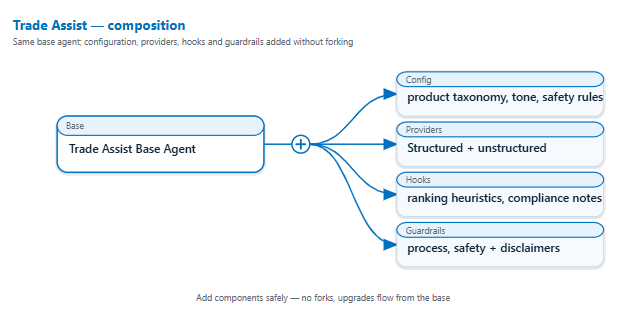 Every customer sells different products and has different business rules. Without composability this agent would fork endlessly.