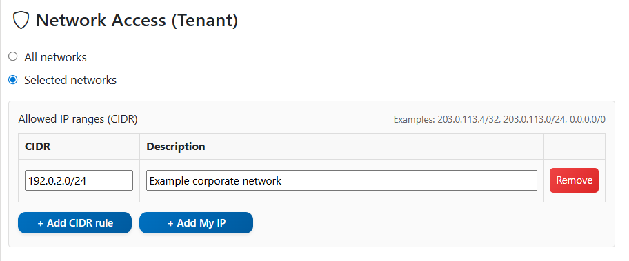- Add one or more CIDR IP ranges to define who can access your tenant